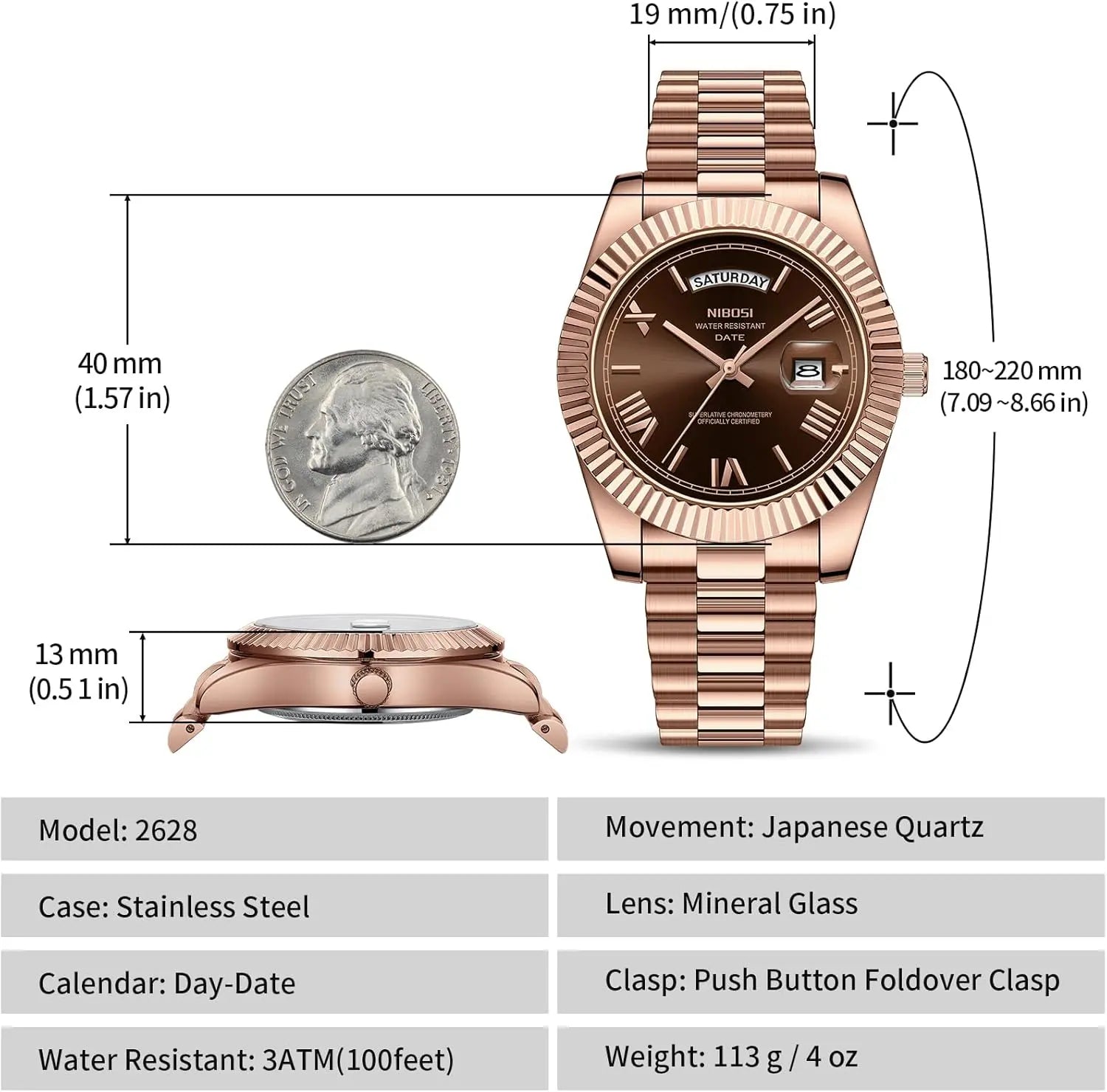 The NIBOSI men's analog watch adopts quality imported quartz movement, stable performance, and accurate time. The durable metal band is removable to adjust to different wrist sizes. The button battery is replaceable to ensure lifelong use.