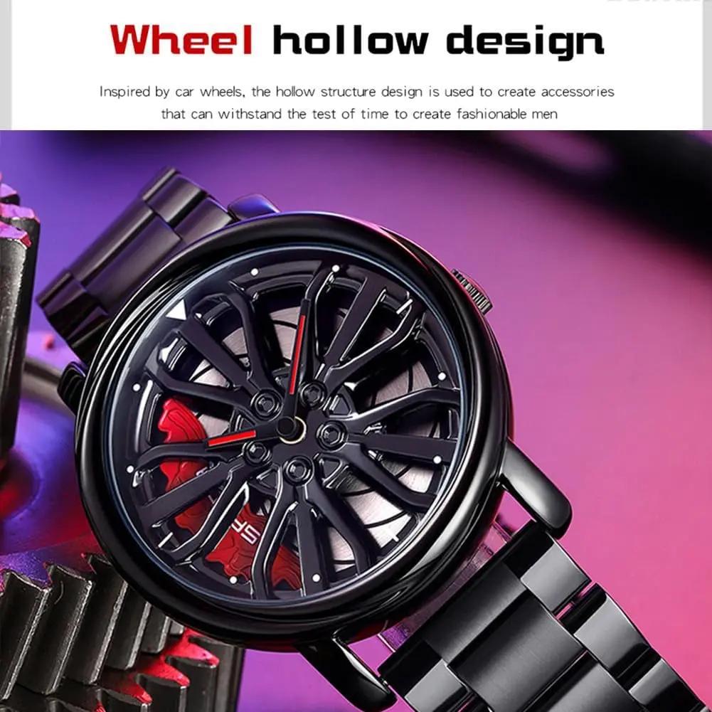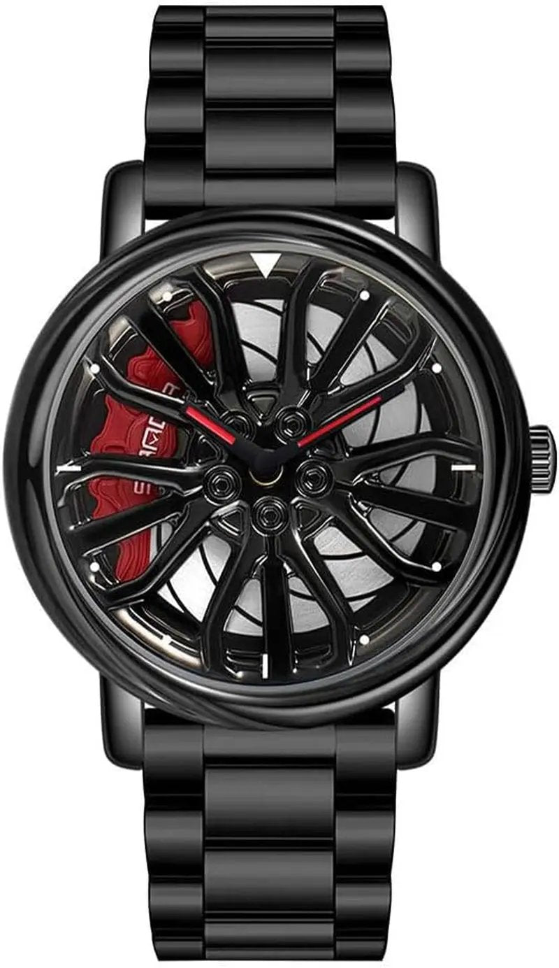 Mens Wrist Watch Creative 3D Spinning Car Wheel Rotating Watches Rim Hub Design Fashion Quartz Stylish Wristwatch with Stainless Steel Strap Gifts for Car Enthusiasts